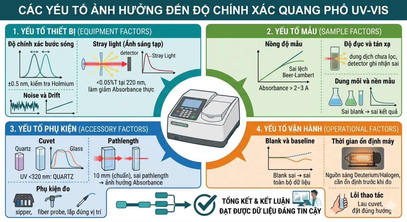 Trong phân tích bằng máy quang phổ UV-Vis, độ chính xác của kết quả không chỉ phụ thuộc vào nguyên lý đo mà còn chịu ảnh hưởng bởi nhiều yếu tố liên quan đến thiết bị, mẫu, phụ kiện và điều kiện vận hành.