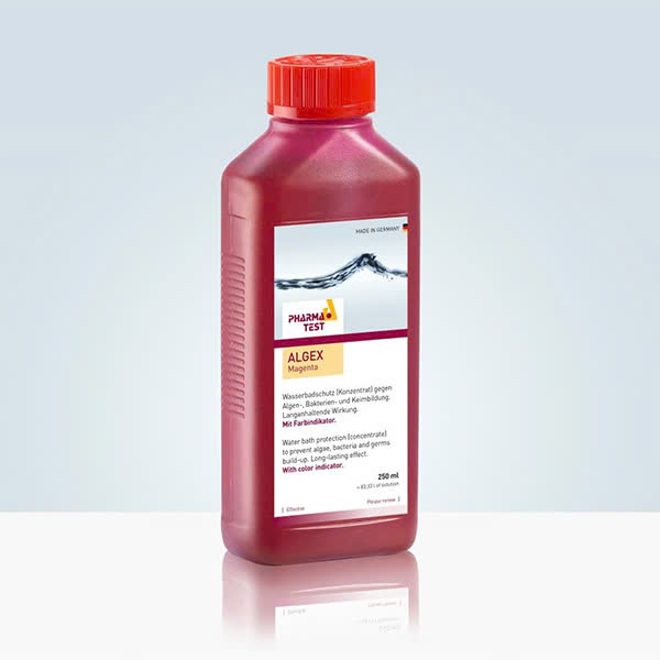 Dung dịch bảo quản ALGEX Magenta (dạng cô đặc) giúp ngăn ngừa sự phát triển của tảo, vi khuẩn và mầm bệnh. Sản phẩm có hiệu quả kéo dài lên đến 3 tháng. Một chỉ thị màu sẽ nhắc nhở bạn khi cần thay thế dung dịch. Mỗi chai chứa 250 ml dung dịch cô đặc, tương đương với 83,33 lít dung dịch sau pha loãng. ALGEX Magenta có thể được mua lẻ theo chai hoặc theo bộ gồm 15 chai với giá ưu đãi.