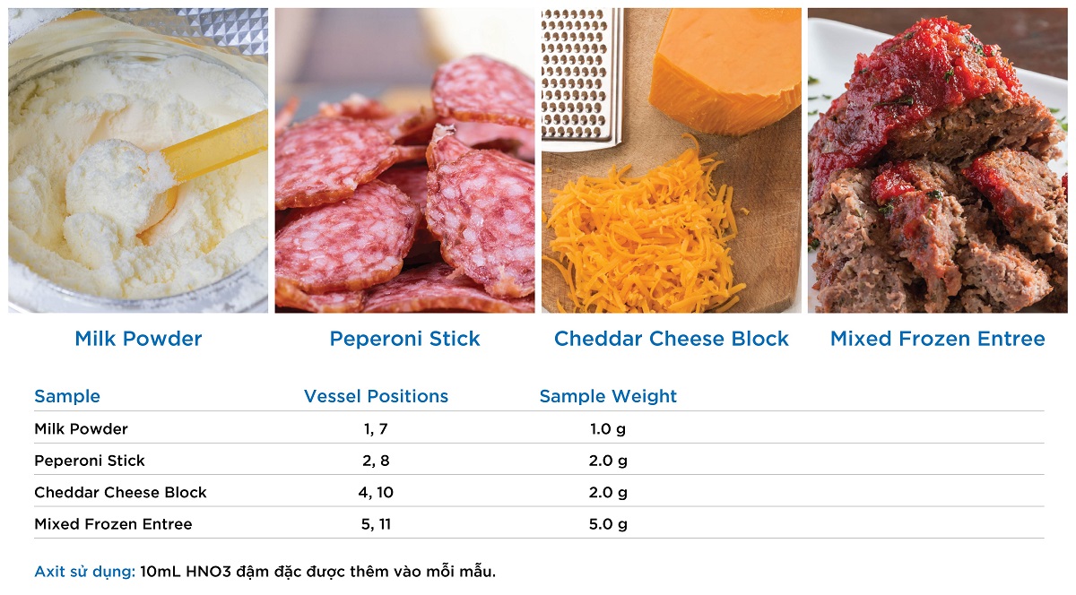 Xúc xích và phô mai được cắt lát, cân và để trực tiếp lên lớp lót iPrep. Sữa bột cân đo và để trực tiếp lên lớp lót. Nghiền các thực phẩm đông lạnh để đảm bảo tính đồng nhất, và sau đó để trực tiếp lên lớp lót iPrep cân đo. Các loại mẫu cũng như trọng lượng được ghi trong Bảng 1 dưới đây. 10mL HNO3 đậm đặc được thêm vào mỗi mẫu. Các bình được đóng nắp và lắp vào bộ xếp mẫu, sau đó được đưa vào MARS 6 để tiến hành phá mẫu. Các bình được phân bố đều xung quanh khoang, ở các vị trí được minh họa trong Bảng 1 dưới đây.