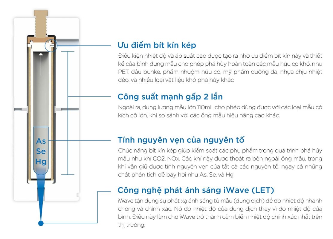 Với công nghệ nắp kép được cấp bằng sáng chế iPrep sẽ giữ nhiệt độ và áp suất cao hơn nhiều so với các bình phá mẫu thông thường. Bình đựng mẫu iPrep cùng với công nghệ iWave – một công nghệ dùng cho việc giám sát nhiệt độ không tiếp xúc mẫu có khả năng đo xuyên qua thủy tinh, các mẫu thực phẩm hỗn hợp đa dạng có kích thước và trọng lượng lớn được phá hủy hoàn toàn trong một lần chạy.