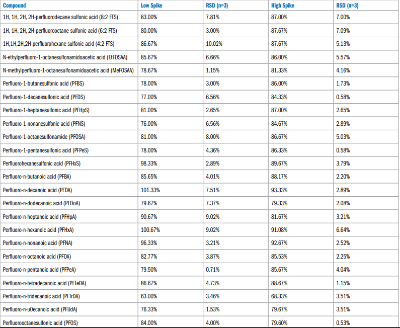 Dữ liệu phục hồi trong Bảng 1 từ các mẫu có đất pha trộn nồng độ thấp và cao cho thấy rằng các mẫu đã được chiết xuất với hiệu suất cao, với tỉ lệ phục hồi dao động từ 63% đến 101%. Các giá trị RSD kết quả cũng thấp, cho thấy dữ liệu phục hồi có độ lặp lại cao. Dữ liệu chiết xuất từ cốc Q-Cup trống chỉ ra rằng không có hiện tượng truyền nhiễm của các hợp chất được pha trộn trong hệ thống, cho thấy quá trình rửa đủ mạnh để loại bỏ bất kỳ hợp chất PFAS dư thừa nào.