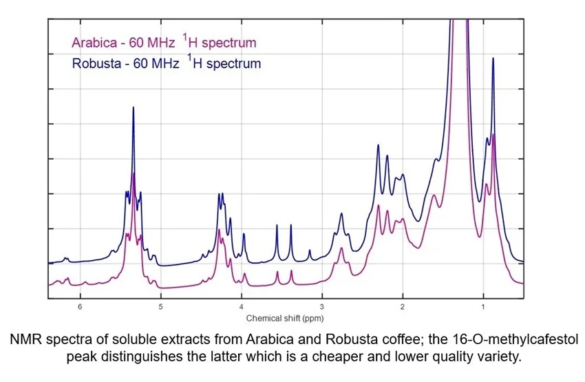 Nhóm của Kemsley đã phát hiện ra rằng họ có thể xác định cà phê Robusta bằng sự hiện diện của đỉnh 16-O-methylcafestol ở độ dịch hóa học 3,16 ppm. Trước đây người ta nghĩ rằng dẫn xuất cafestol này có mặt trong Arabica, nhưng nhóm nghiên cứu đã tìm thấy điều này bằng cách phân tích nhiều loại đậu được biết là xác thực. Họ cũng đã sản xuất một công cụ phần mềm để thực hiện phép phân tích này.