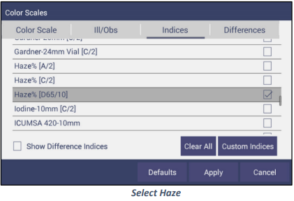 b. Sau đó đến tab ILL/OBS và chọn D65/10; chọn tab INDICES và kiểm tra Haze%[D65/10]. EBC và ASBC.