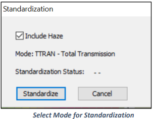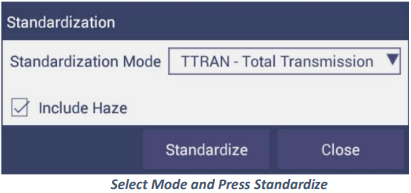 b. Nhấp vào nút STANDARDIZE ở dưới màn hình Essentials. Chọn chế độ TTRAN và chọn INCLUDE HAZE cho Tiêu chuẩn hóa và đo lường. Nhấn STANDARDIZE để tiếp tục.