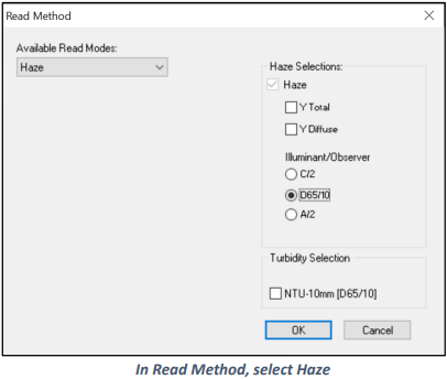 a. Trong EasyMatch QC, đi đến OPTIONS > READ METHOD và chọn HAZE từ menu thả xuống. Đánh dấu HAZE% và ILL/OBS là D65/10. Nhấp OK để áp dụng.
